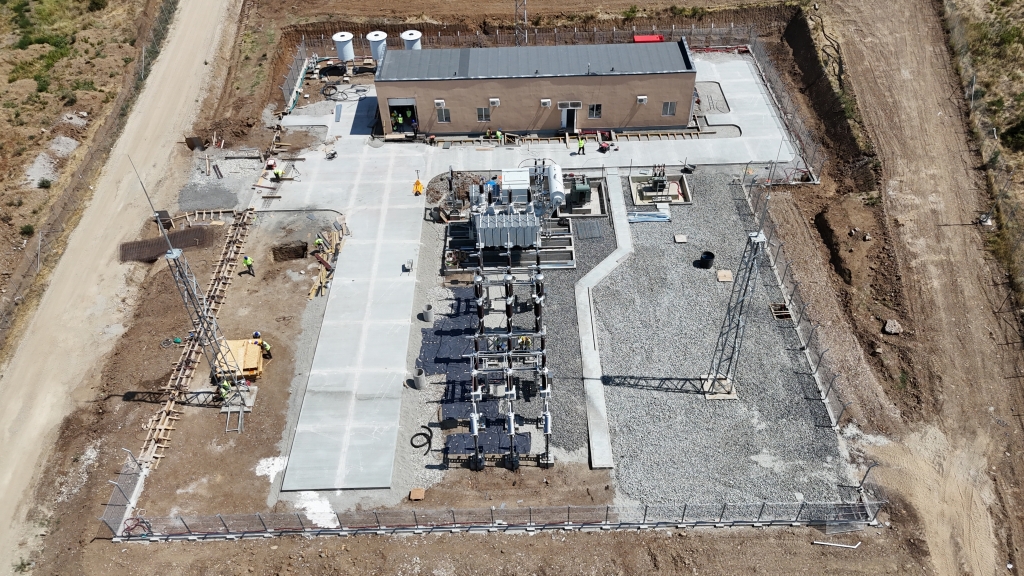 Construction work on the substation is underway – external platforms, fencing, and electrical connections are being installed.